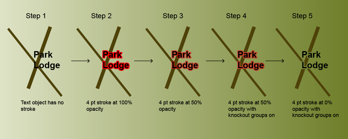 (Figure 7) Notice the difference between Step 3 and Step 4. With Knockout Group ON, the brown line is hidden wherever the red stroke is.