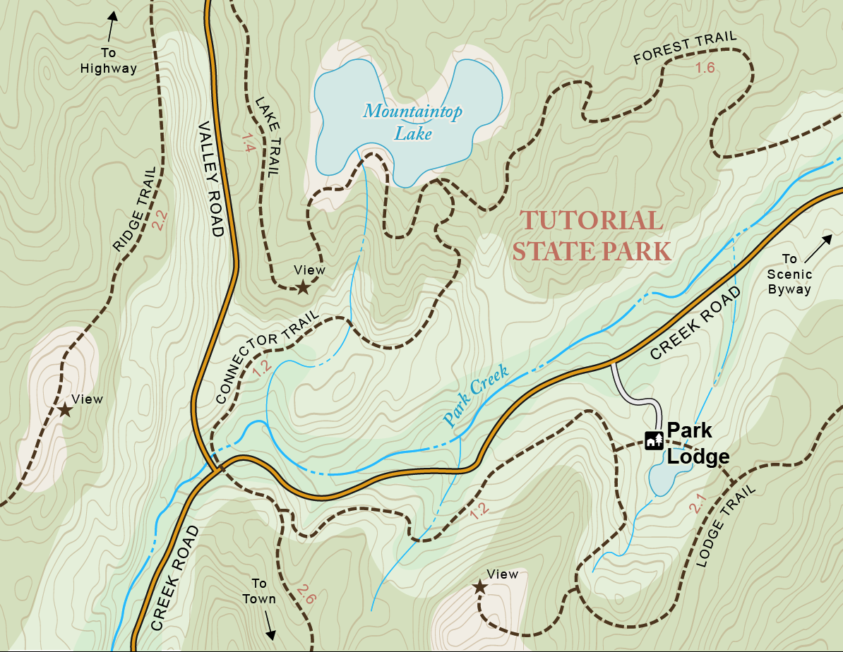 (Figure 1) Labeling WITHOUT Knockout Groups. The stream, trail, and contours touch the label, which can be difficult to read at small scales