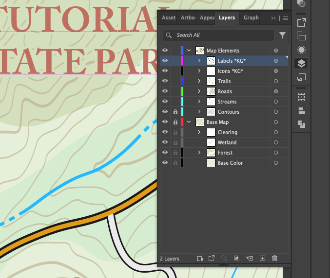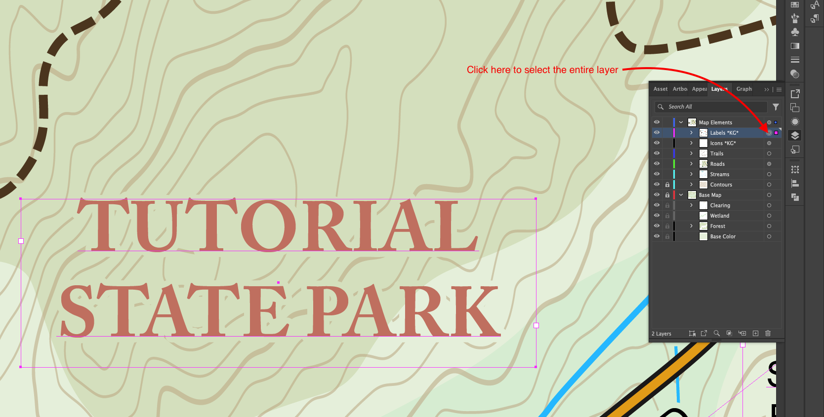 Once you have the stroke set up, select the Layer your text sublayer is inside. If you are following along with the map, it is the “Map Elements” layer (See Figure 8).