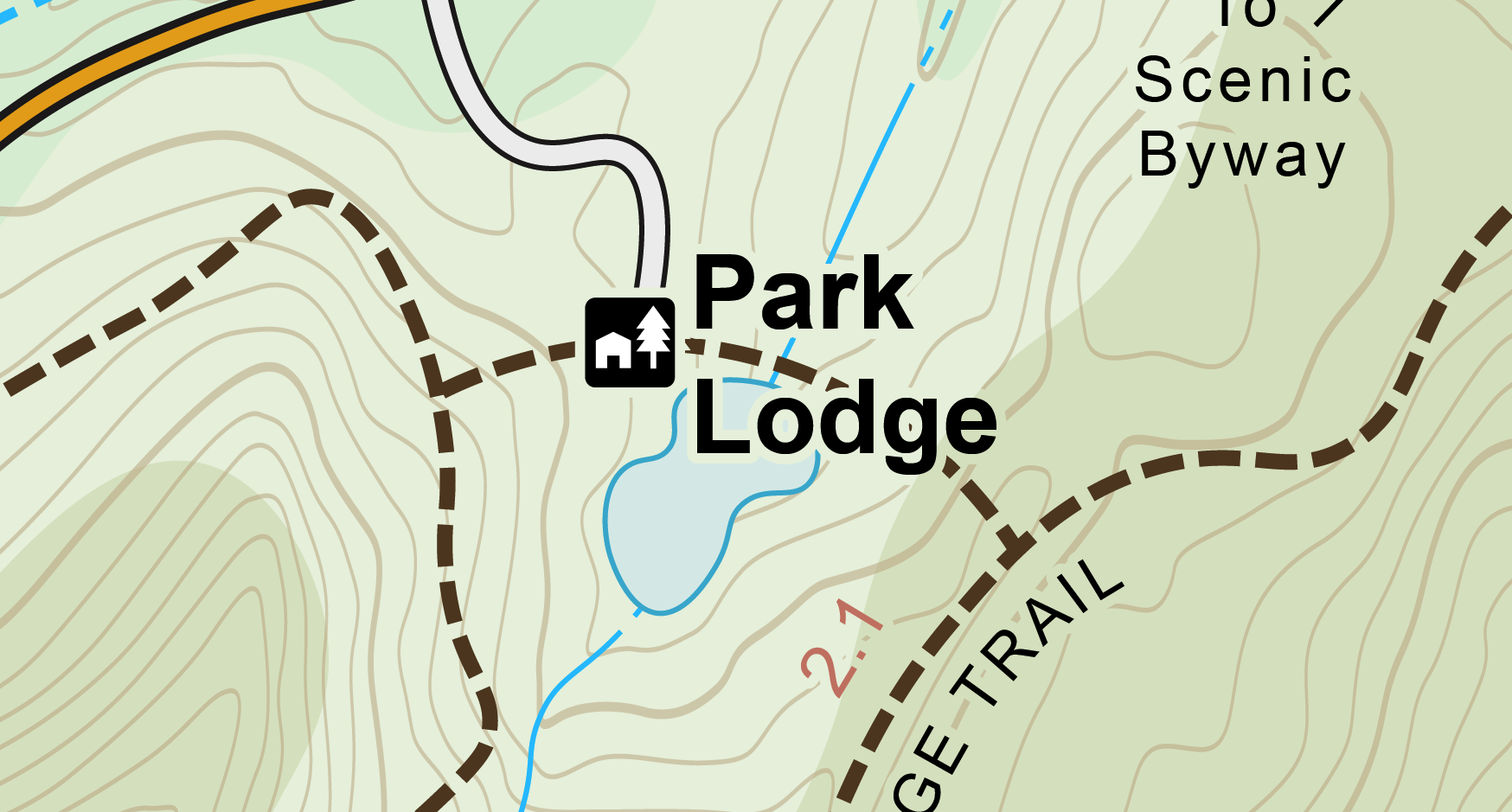(Figure 2) Labeling WITH Knockout Groups. Notice the buffer around the “Park Lodge” text. Knockout Groups create a nice offset around the text, making for a clean look.
